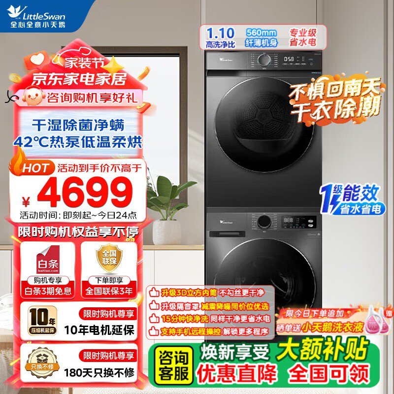 小天鹅洗烘套装10kg大容量洗烘一体机仅2898元