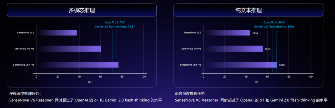 相比此前 V5.5 版本,日日新 V6 / V6 Reasoner 推理能力显著增强。其中在多模态推理任务上,SenseNova V6 Reasoner 同时超过了 OpenAI 的 o1 和 Gemini 2.0 flash-thinking 。在语言深度推理任务上,SenseNova V6 Reasoner 也同样超过了 OpenAI 的 o1 和 Gemini 2.0 flash-thinking。