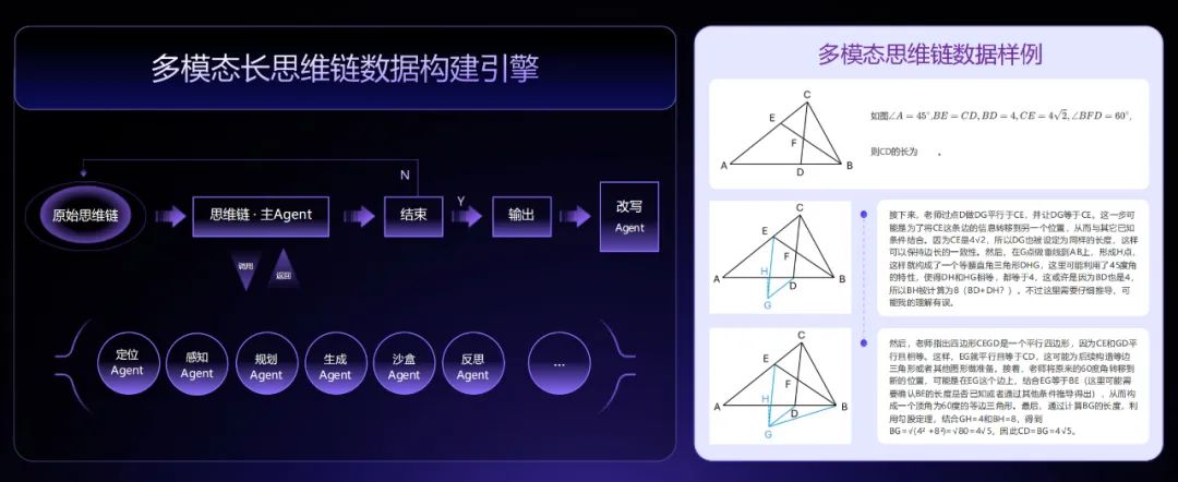 模态越多,大模型处理的实际上下文就越长。在思维链上,商汤通过多智能体协作进行长思维链合成和验证,实现了多模态长思维链合成技术,可以支持合成最长 64K token 的多模态长思维链,这相当于让模型在给出答案之前可以连续进行长达 6 万字的思考,让模型具备了面对复杂问题的长时间思考能力。