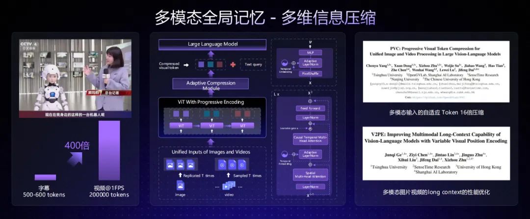 最后,日日新 V6 还具备独一无二的长视频统一表征和动态压缩能力,它可以将视觉、听觉、文本、时间轴逻辑进行对齐,形成多模态统一的时序表征,通过细粒度级联信息压缩和内容敏感的动态过滤,实现长视频的 400 倍高比例压缩。据介绍,商汤的大模型可以把 10 分钟视频压缩到仅有 16K tokens,仍能保留关键语义。