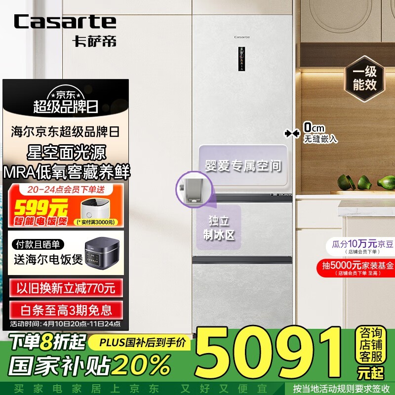 卡萨帝原石超薄零嵌三开门冰箱406L大容量到手4442元