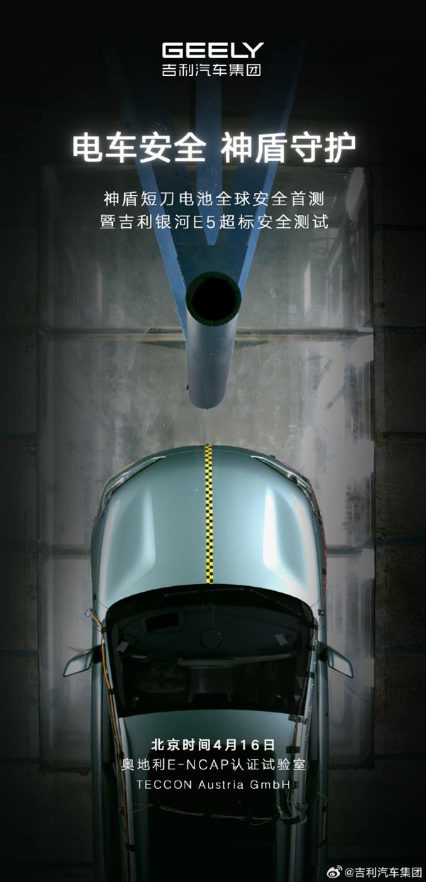 快科技4月11日消息,吉利汽车宣布,将于4月16日进行神盾短刀电池全球安全首测。