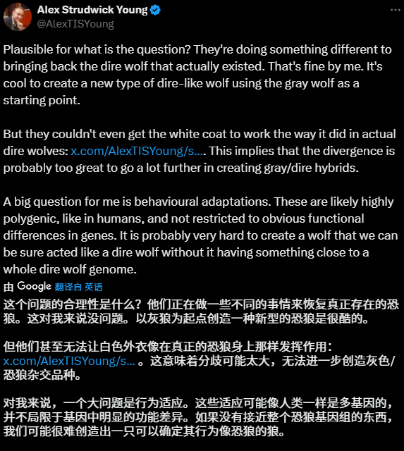 而加州大学洛杉矶分校统计遗传学的杨教授,也表达了同样的看法:“它不是冰原狼——而是经过修改的灰狼,更像冰原狼。这是一项很酷的成就,但他们并没有‘让冰原狼复活’。”