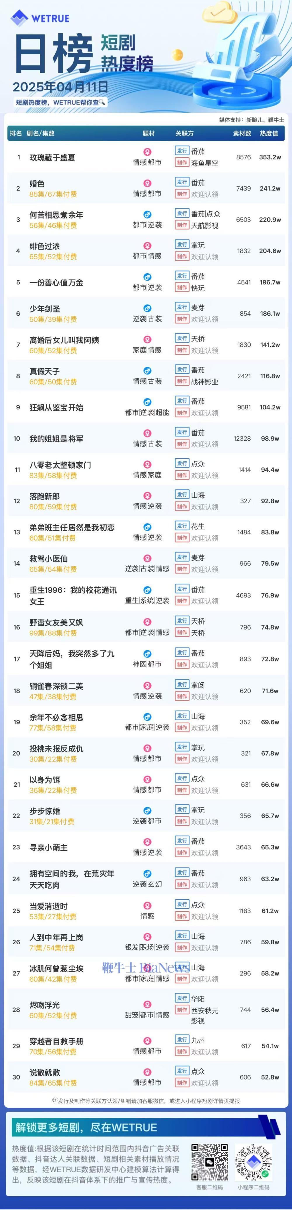 1、本日榜为WETRUE短剧数据公司提供,新腕儿和鞭牛士提供联合支持。