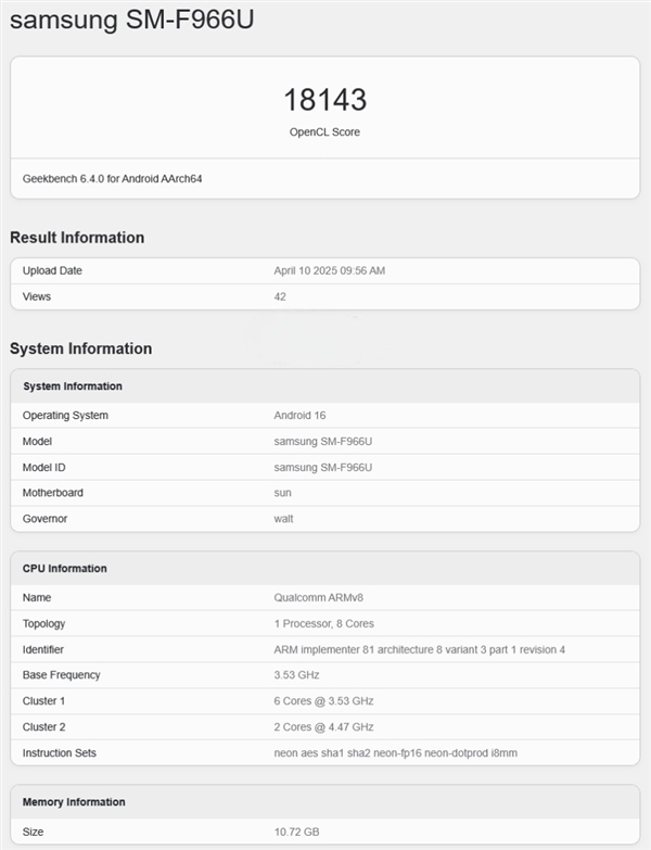 跑分数据显示,三星Galaxy Z Fold7配备了4.47GHz高频版高通骁龙8至尊版芯片,辅以12GB内存和Adreno 830 GPU。
