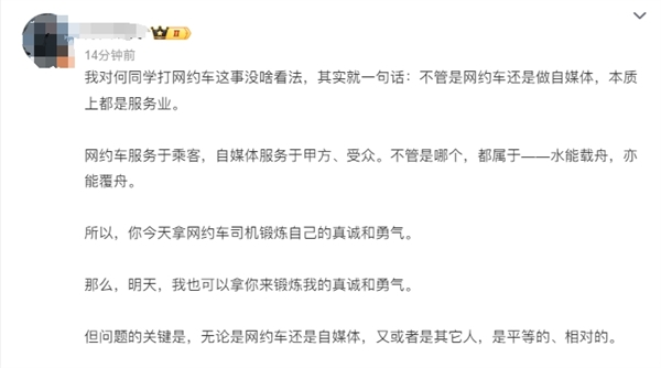 何同学发文称:“以前打网约车,司机师傅跟我说打个好评,我都会说好好好,但是下车后也没想起来打。其实这样挺不好的。现在司机师傅跟我说打个好评,除非服务真的很好到我想打好评的程度,否则我就会直接说,抱歉我不想打,然后下车。作为一个有讨好倾向的人,这是我锻炼真诚和勇气的方式。”