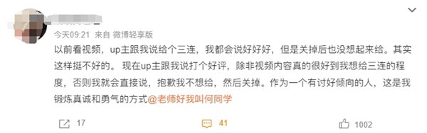 有网友用UP主的方式类比,何同学本人每一期视频结尾都会求“一键三连”,很多网友表示下次自己也要好好想想,除非视频真的很好的成都,否则直接划走。