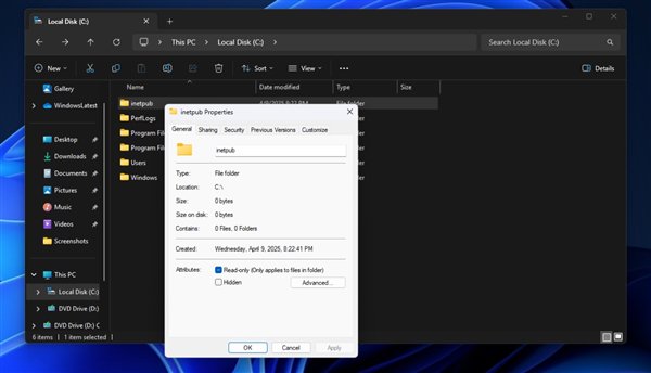 “inetpub”文件夹通常与IIS(Internet Information System)相关,用于在Windows 11上托管网站或应用程序,但在此次更新中,即使用户未启用IIS,该文件夹也会自动创建。