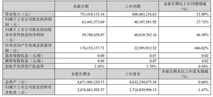 第一季度,聚灿光电科技股份有限公司实现营业收入 7.31亿元,同比增长 21.80%;实现归母净利润 6,144.16 万元,同比增长 27.72%;实现扣非净利润 5,978.87 万元,同比增长 46.50%,实现经营活动产生的现金流量净额 17,615.31 万元,同比增长 666.02%。