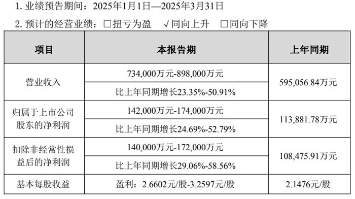 公司预计 2025 年第一季度实现归属于上市公司股东的扣除非经常性损益的净利润为 17,000 万元到 19,000 万元,与上年同期相比,将增加 6,153.48 万元到 8,153.48 万元,同比增加 56.73%到 75.17%。