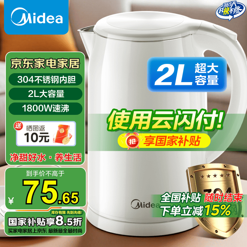 美的SH20M320电热水壶2L,京东优惠价53.37元