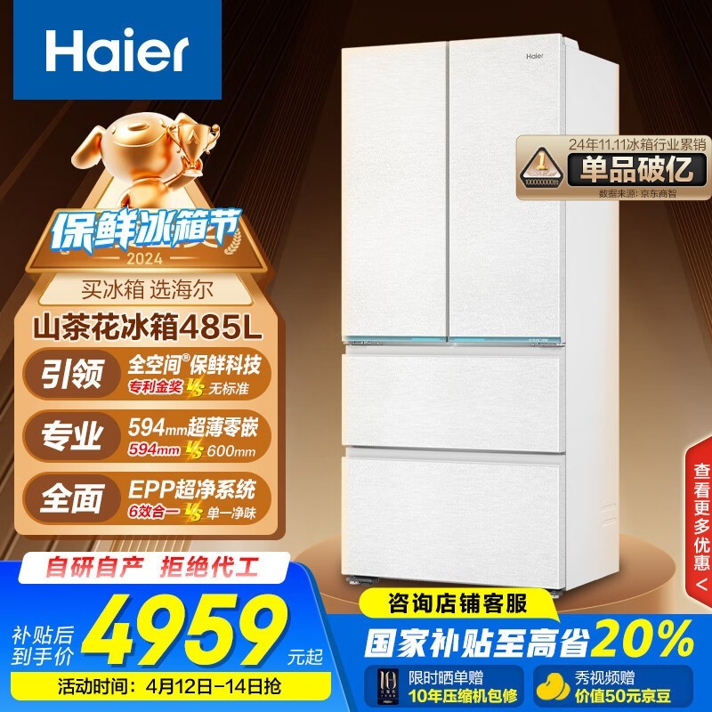 海尔485升多门冰箱一级变频风冷无霜仅4539元