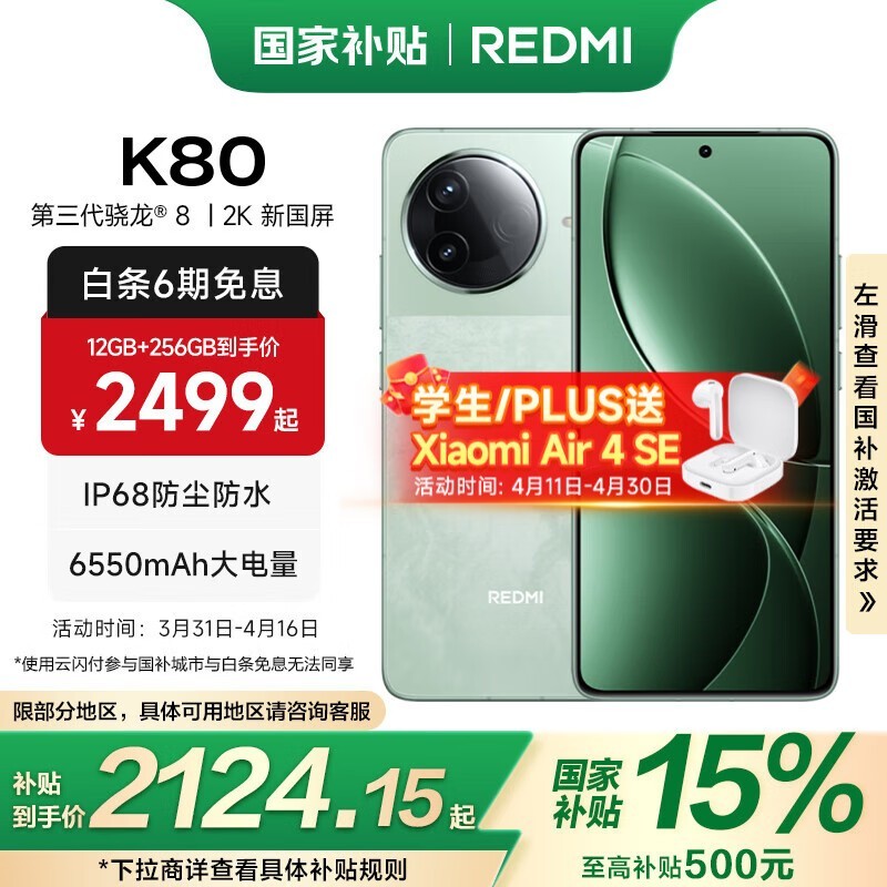 红米K80 5G手机性能旗舰12GB+256GB山峦青配色仅2124元