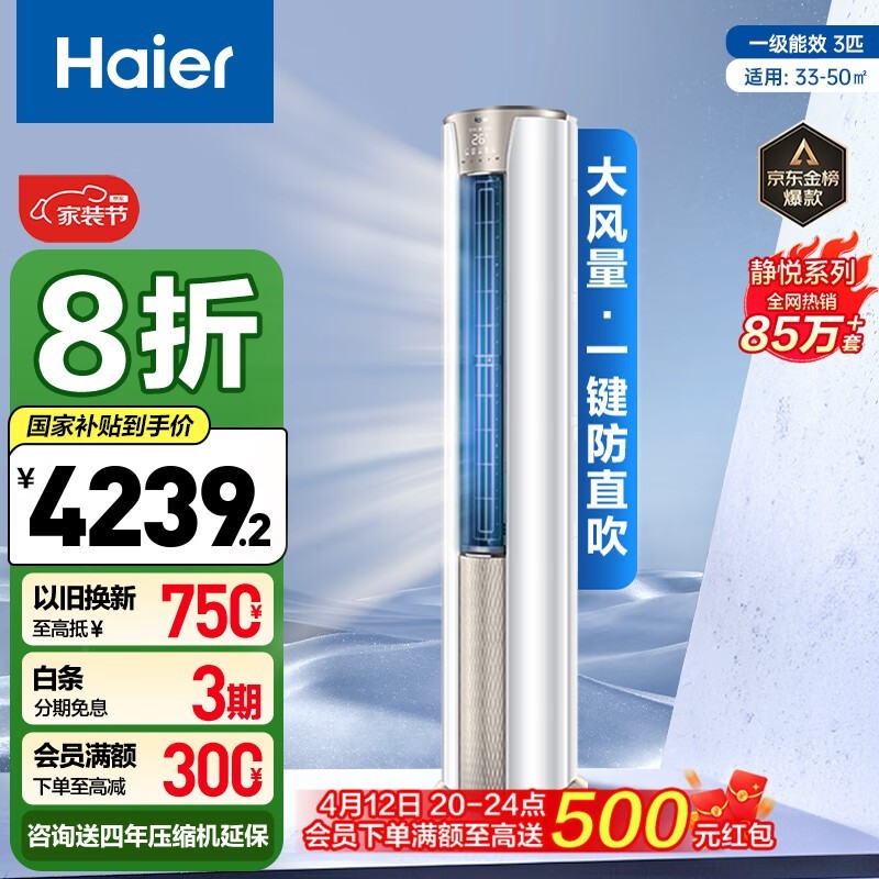 海尔静悦系列立柜式空调3匹新一级能效大空间理想选择