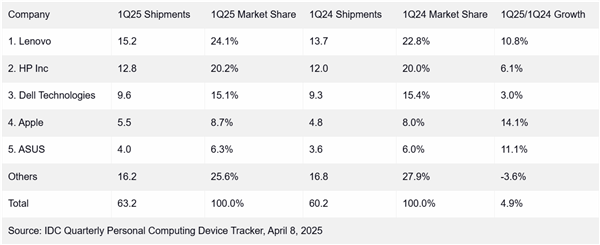快科技4月12日消息,根据国际数据公司(IDC)发布的数据显示,2025 年第一季度,全球个人电脑出货量实现连续六个季度增长,较上年同期增长4.9%,达到6320万台,超出此前预测的6240万台(同比增长3.7%)。