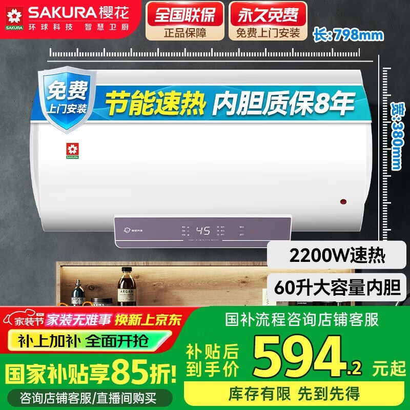 樱花60L电热水器,京东价591元超值