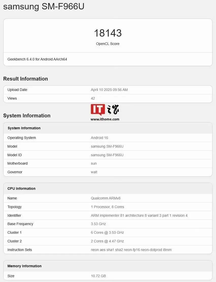 而根据最新OpenCL跑分库数据,三星Galaxy Z Fold7折叠手机得分为18143分,页面显示该机配备4.47GHz高频版高通骁龙8至尊版芯片,配备12GB内存 Adreno 830GPU。