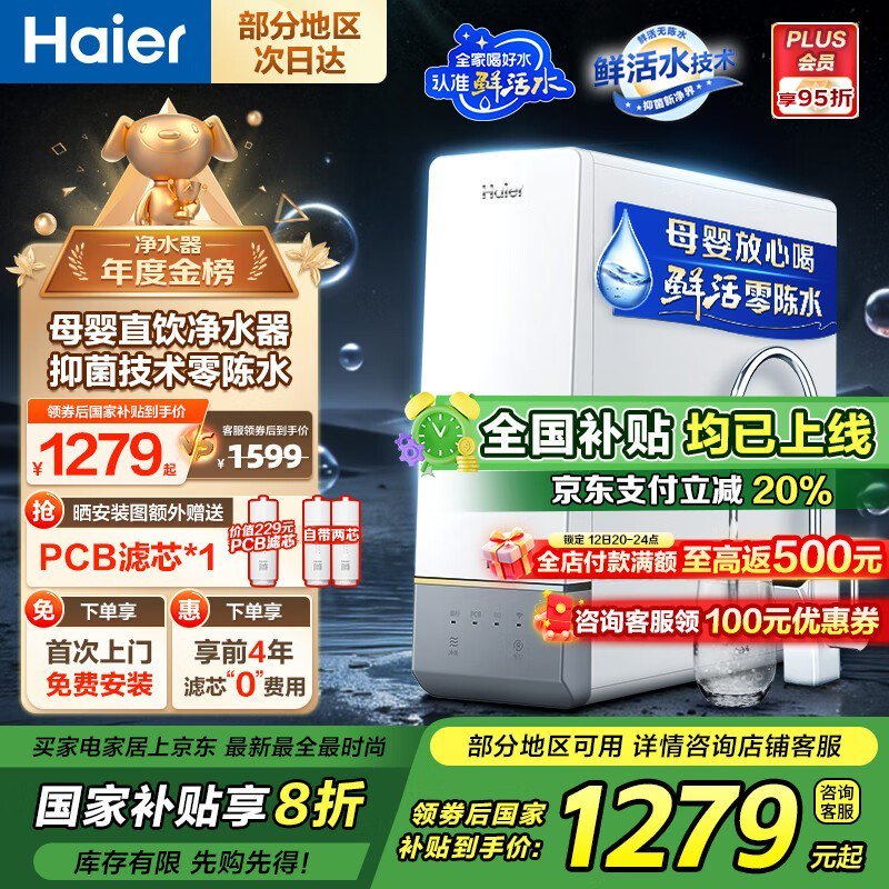 海尔智纯系列1000G纯水机促销,到手1131元
