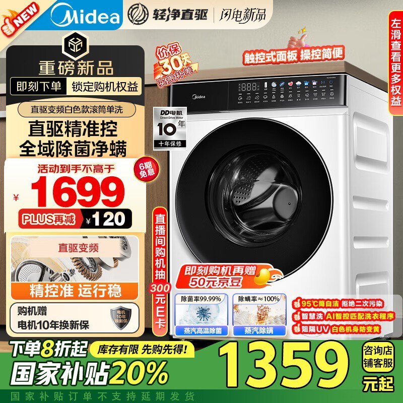 美的10kg滚筒洗衣机,京东优惠价1025元