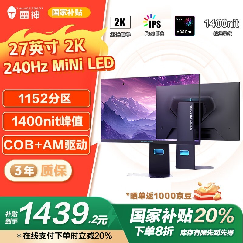 雷神黑武士CQ27F240M显示器京东特惠1422元享丝滑体验