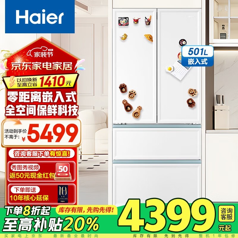海尔501L超薄零嵌多门冰箱低至3325元抢购