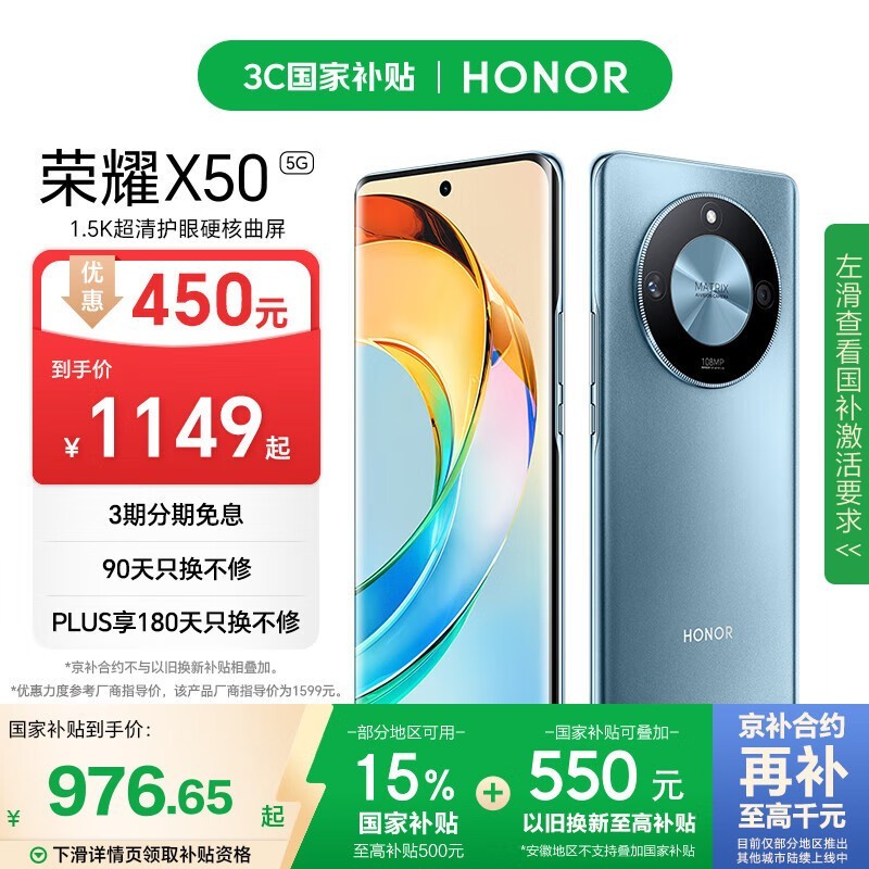 荣耀X50手机勃朗蓝配色京东热卖1149元享超值优惠