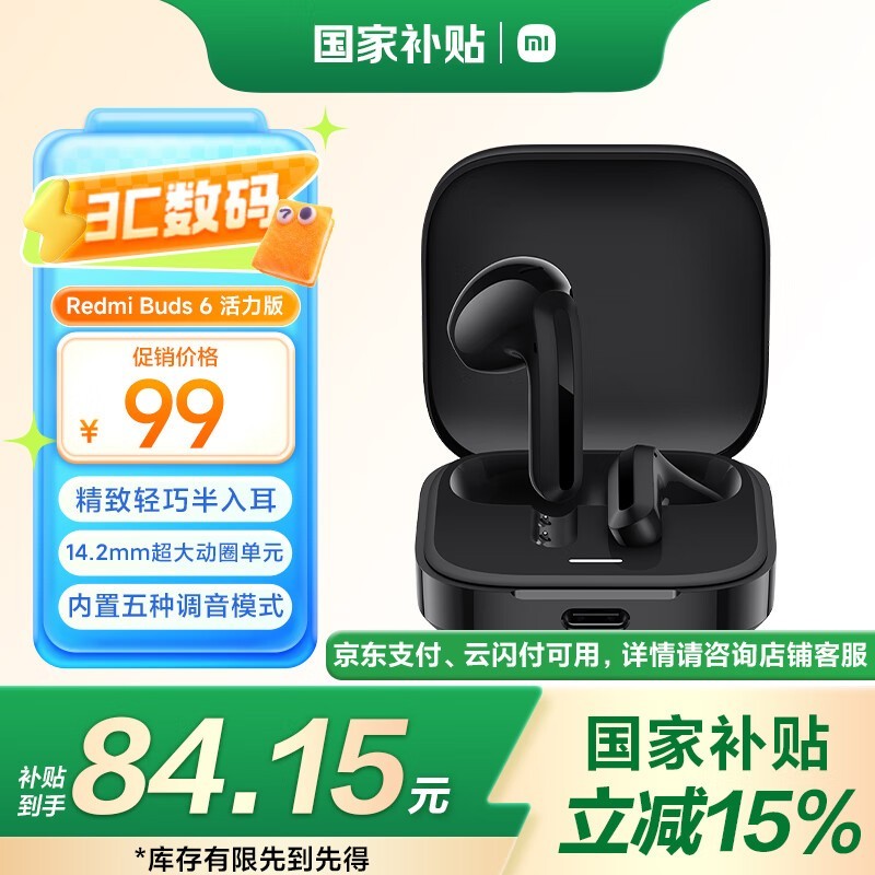 红米Buds 6活力版蓝牙耳机黑色款京东促销到手价83元