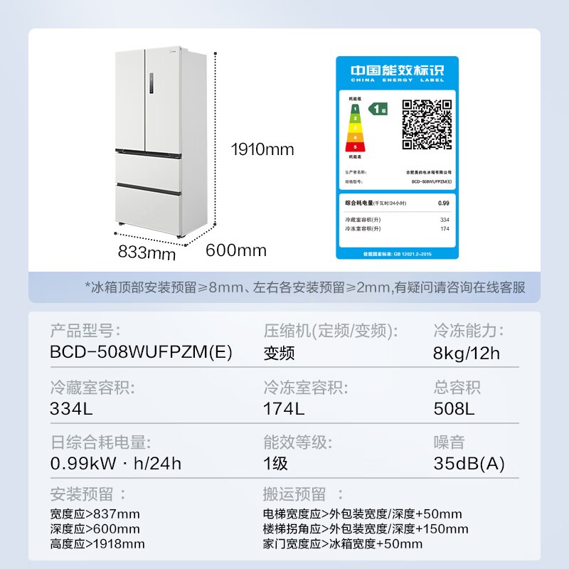 美的真香系列M60法式多门冰箱508升双系统超薄平嵌星尘白促销