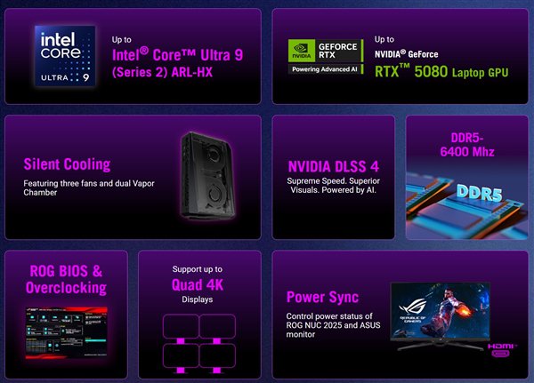 这次发布的升级版ROG NUC 2025,采用了最新的酷睿Ultra 9 275HX处理器(官方图错误地放了个Lunar Lake示意图),搭档最新的RTX 5080 Laptop移动显卡,可以说是目前能塞进迷你机的第二强组合了。