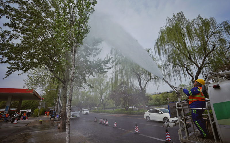 ▲2025年4月9日,北京永定门东滨河路,工作人员给路边的杨树喷水抑制杨柳絮,喷向树冠的水雾中掺入了新研发的凝絮剂。新京报记者 薛珺 摄