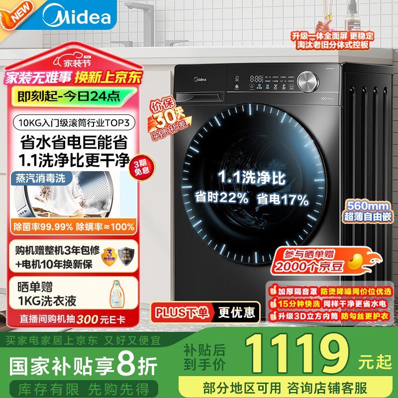美的MG100V36T滚筒洗衣机10kg京东优惠价900元