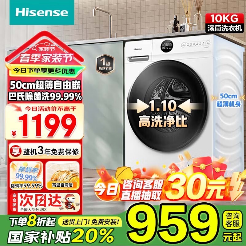 海信HG10JE1 10KG滚筒洗衣机到手价1179元