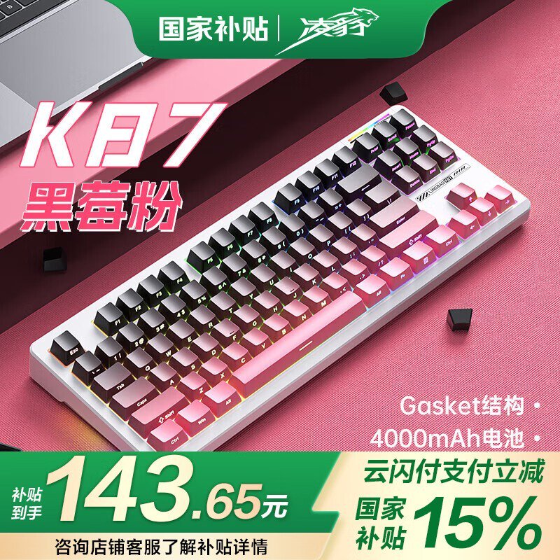凌豹K87三模机械键盘烟紫轴侧刻黑莓粉白壳版促销