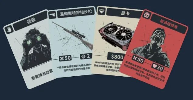 传统“搜打撤”游戏里的遭遇战,被这款游戏浓缩成了一场牌局。几位玩家围坐一桌,轮流从包含了战术卡、武器卡、物资卡和丧尸卡的共用牌堆中抽牌。一旦抽中丧尸牌,就需要消耗武器将它击退,或者被它咬中掉血。
