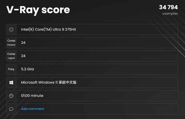渲染采样率方面,首先是V-Ray Benchmark,1分钟测试时间总体采样数达到34794 vsamples,相比14代酷睿i9-14900HX提升不少。