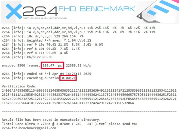 首先在H.264编码方面,编码2500帧的速度为119.47fps,完成用时仅为21秒,视频编码效率再度大幅升级,这也是英特尔酷睿处理器一直以来的强项。