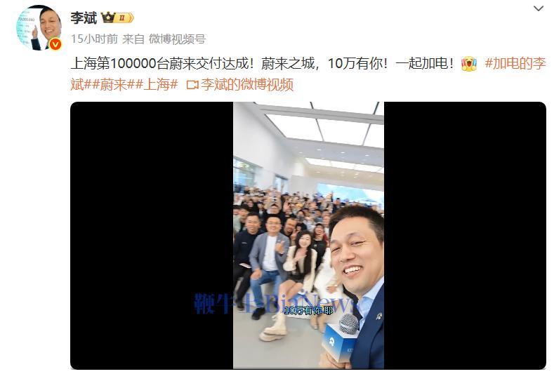 4月14日,蔚来董事长李斌昨日在微博宣布,上海第10万台蔚来交付达成。