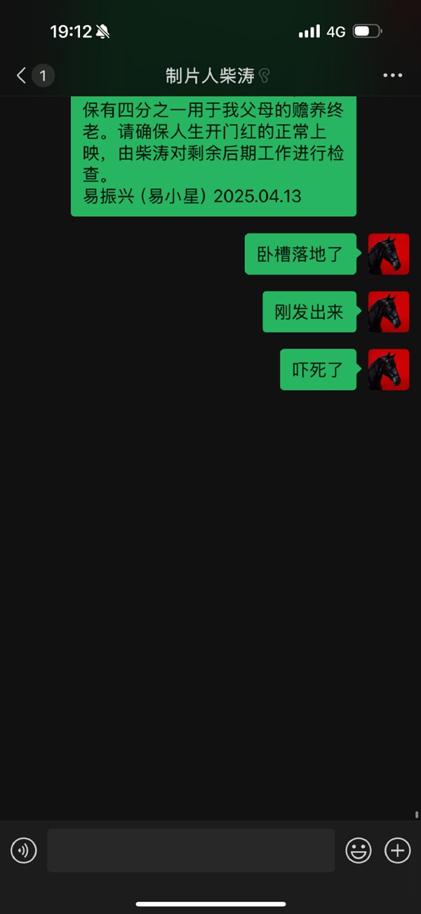 据了解,易小星和演员胡先煦、邓家佳乘飞机回北京遇大风,安全落地后,易小星晒出聊天记录,透露自己被吓到给制片人发遗书。