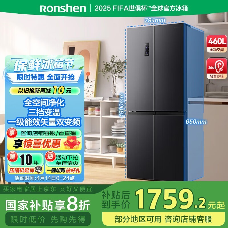 容声460L十字对开门冰箱离子净味系列京东特惠至1751元