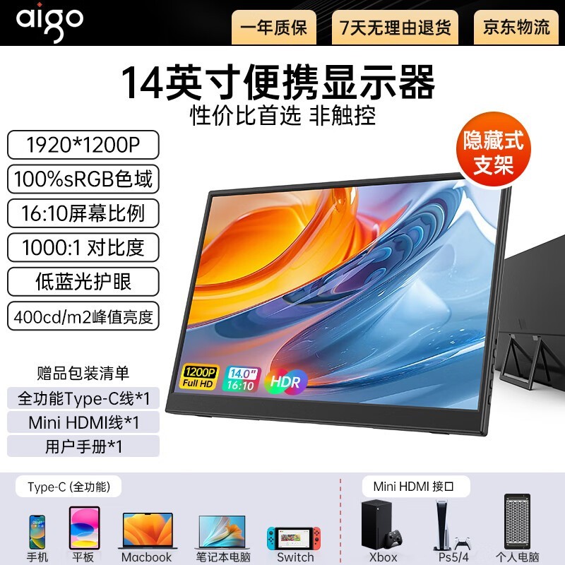 爱国者14寸便携显示器,京东价301元超划算