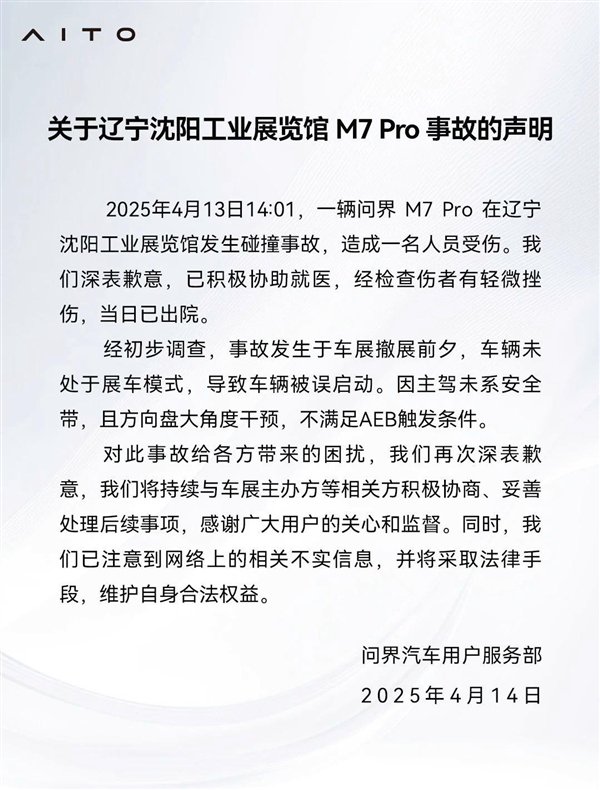 快科技4月14日消息,今日,问界用户服务发布《关于辽宁沈阳工业展览馆M7 Pro事故的声明》。