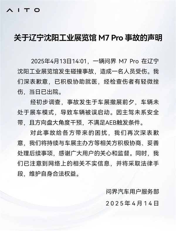 针对此事,问界客户支持已经发布了声明,称事车辆为M7 Pro,此事造成一名人员受伤,深表歉意,已积极协助就医,经检查伤者轻微挫伤,当日已出院。