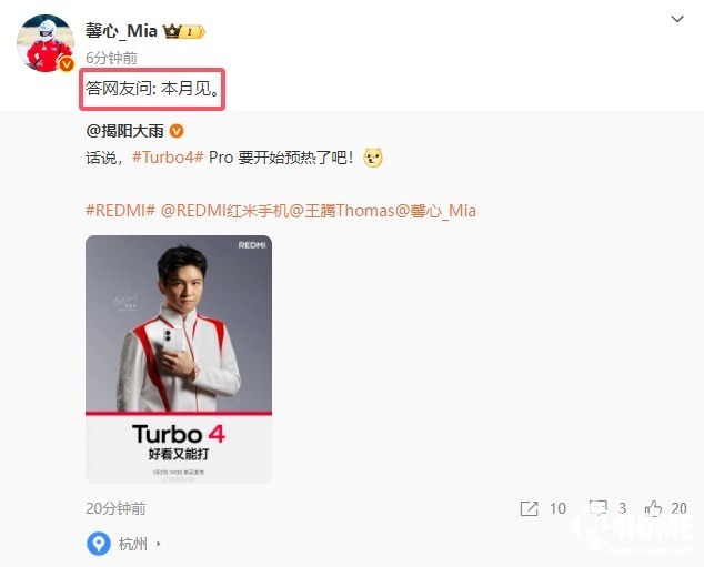 REDMI产品经理@馨心_Mia在今天发出了一条微博,答网友问: 本月见。显然,这是透露了REDMI Turbo4 Pro的发布时间了,该机肯定会在4月推出。
