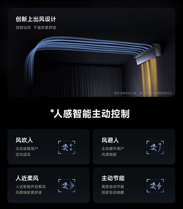 新品最大的亮点就是加入了双毫米波雷达,机器自带中央空调同款米家人感控风技术,可以实现风吹人、风避人、人近柔风,按需送风。