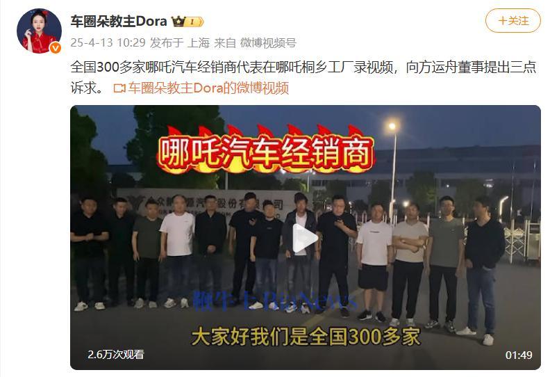 近日,还有博主分享了一条全国哪吒汽车授权经销商代表,在哪吒桐乡工厂门前的维权视频,引起广泛关注。