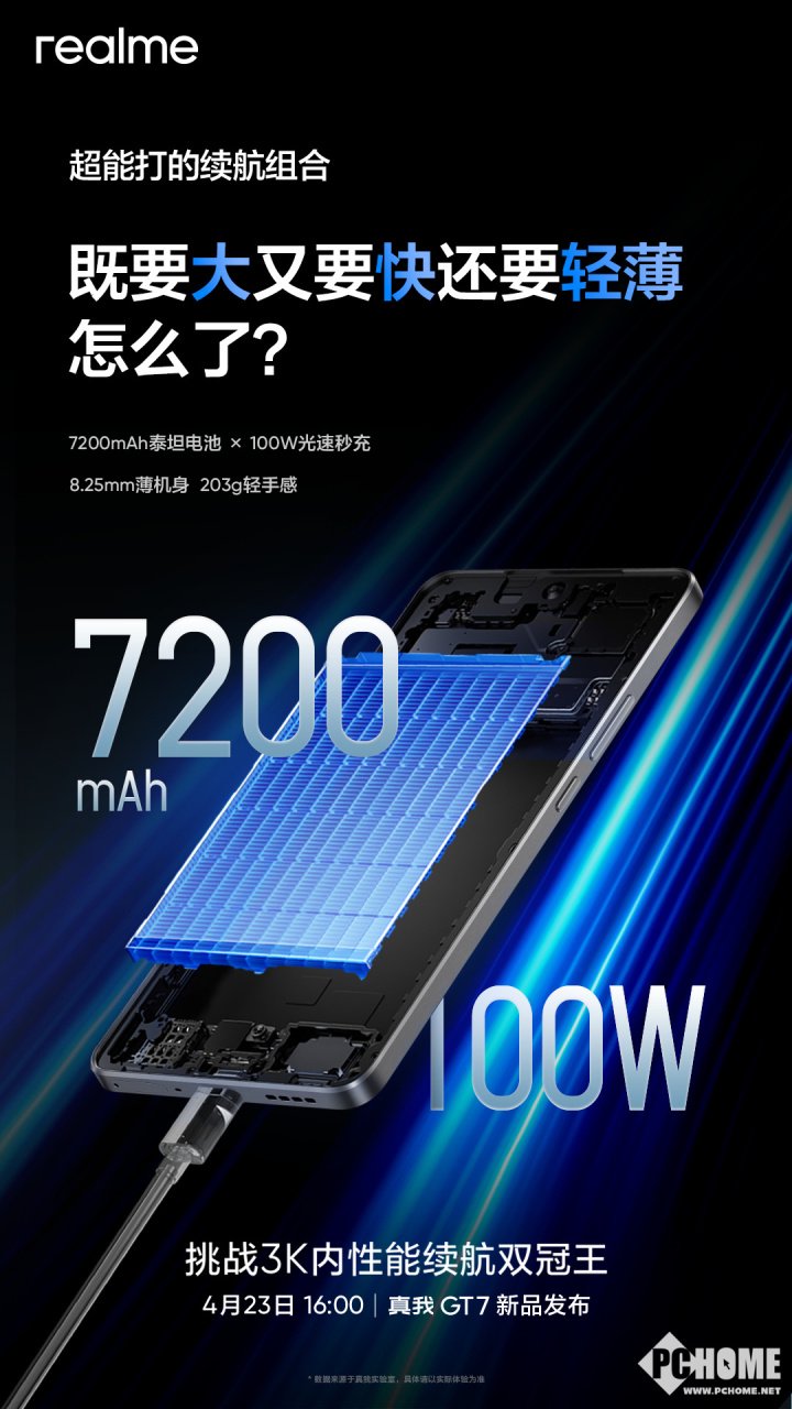 realme真我手机官方再次放出了新机真我GT7的规格,该机在续航方面表现十分出色,不仅配备了7200mAh泰坦大电池,还支持了100W光速秒充。