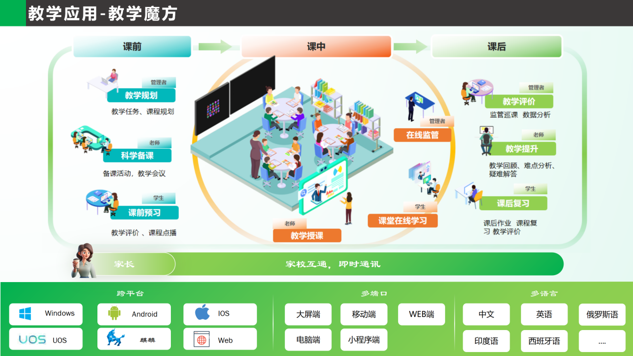 「安道教学魔方」构建了完整的教学链条:课前支持预习资源推送与学生自主学习;课中结合智能终端(如智能交互平板、PC端、移动端)实现互动教学,提升课堂参与度;课后依托数据分析生成学情报告,辅助巩固与测评,形成“因材施教"的动态反馈机制。当前,安道教学魔方深度融合国产化生态适配统信、麒麟等操作系统,确保从Windows系统切换的无缝过渡,保障信息安全与用户使用的流畅性。
