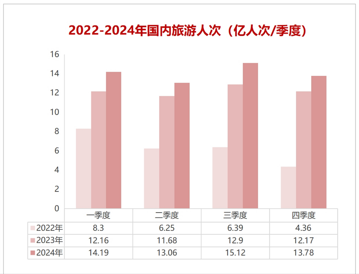 其中,2024年一季度国内出游人次14.19亿,同比增长16.7%;二季度国内出游人次13.06亿,同比增长11.8%;三季度国内出游人次15.12亿,同比增长17.2%;四季度国内出游人次13.78亿,同比增长13.2%。