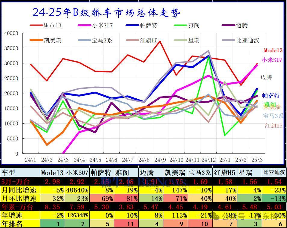 据崔东树发布的数据,B级轿车2025年3月批发35.06万台,占批发份额33.51%,批发较去年同期同比增长2%,批发环比今年上月增长37%;2025年3月零售较去年同期同比增长18%,零售环比今年上月增长37%。2025年1-3月批发数量91.73万台,厂家批发销售累计增幅7%;2025年1-3月国内零售数量83.37万台,零售累计增幅12%。