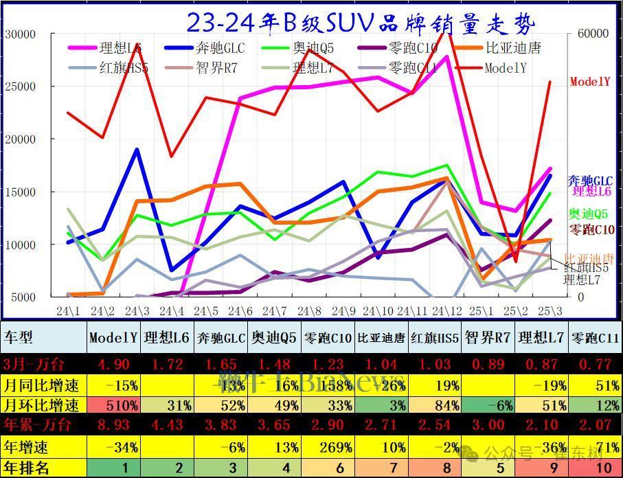 2025年3月,B级SUV批发30.7万台,占批发份额24.42%,批发较去年同期同比增长6%,批发环比今年上月增长48%;2025年3月零售较去年同期同比增长9%,零售环比今年上月增长60%。2025年1-3月批发数量78.29万台,厂家批发销售累计增幅持平;2025年1-3月国内零售数量70.51万台,零售累计增幅1%。